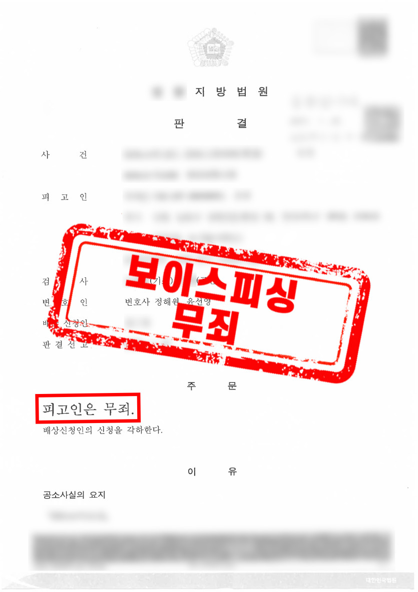 법원은 '검사가 제출한 증거만으로는 피고인이 보이스피싱 범죄에 가담한다는 인식이 있었다고 보기 어렵고 달리 이를 인정할 증거가 없다.'라고 하며, 무죄를 선고하고, 배상신청인의 신청을 각하 하였습니다.
