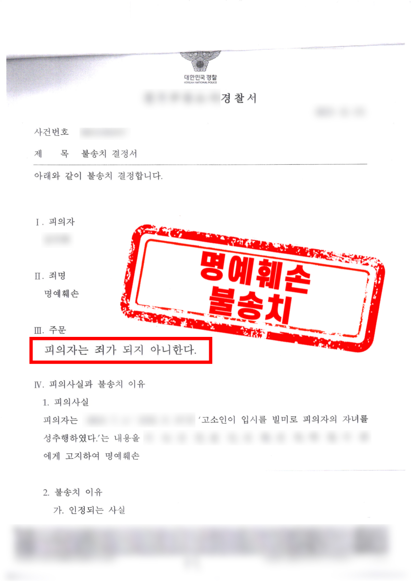결국 의뢰인은 경찰 단계에서 명예훼손 혐의에 대해 무혐의 처분을 받아 더 이상의 수사를 받지 않게 되었습니다.